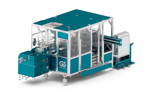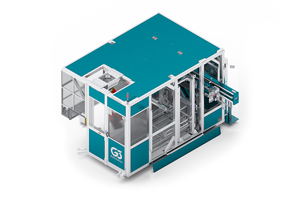 It has a Kuka® 6 axis robotic arm, for the organized transport of the cutlery to the flowpack packaging area.